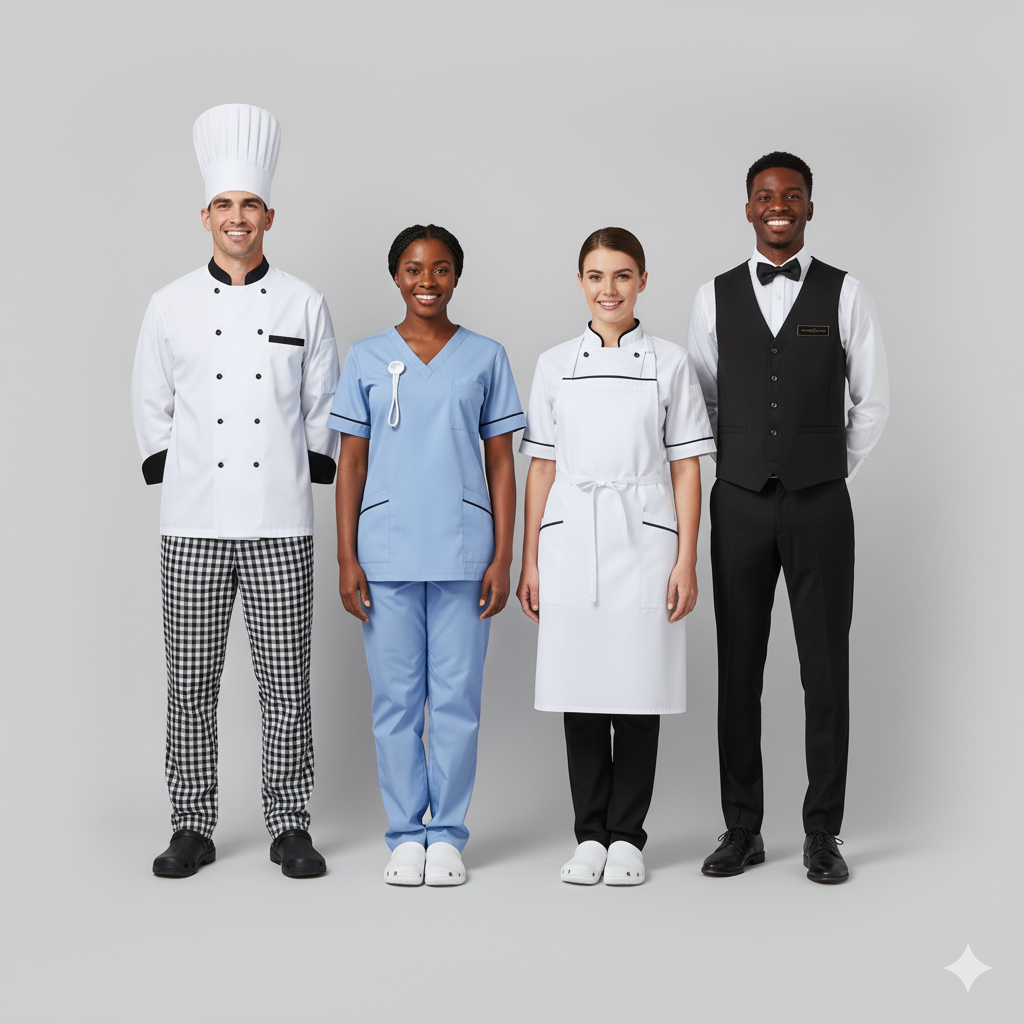 Professional uniforms for hospitality staff including chefs, waiters, housekeeping, and front desk personnel. Designed for comfort and style.