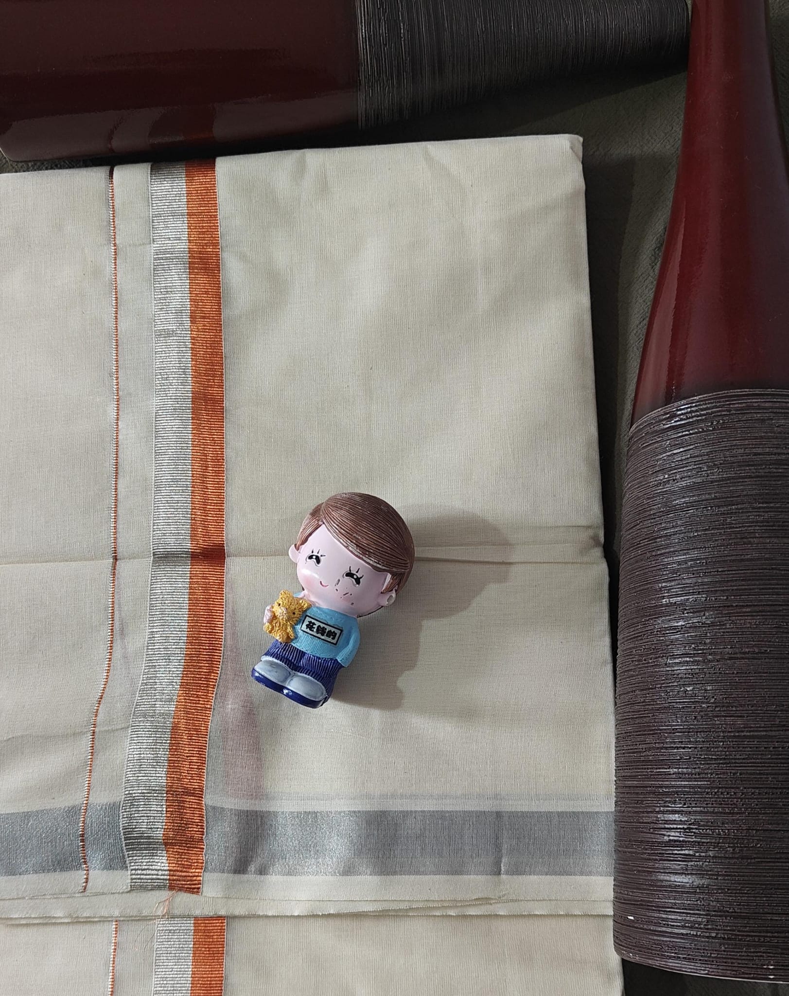 Step into tradition with this elegant Kerala-style Double Dhothi featuring a 1-inch Copper & Silver Kara with a Silver Border. Made from super premium textured cotton, it offers a perfect blend of cultural richness and comfort. Ideal for festive occasions like Onam, weddings, temple visits, or traditional ceremonies.