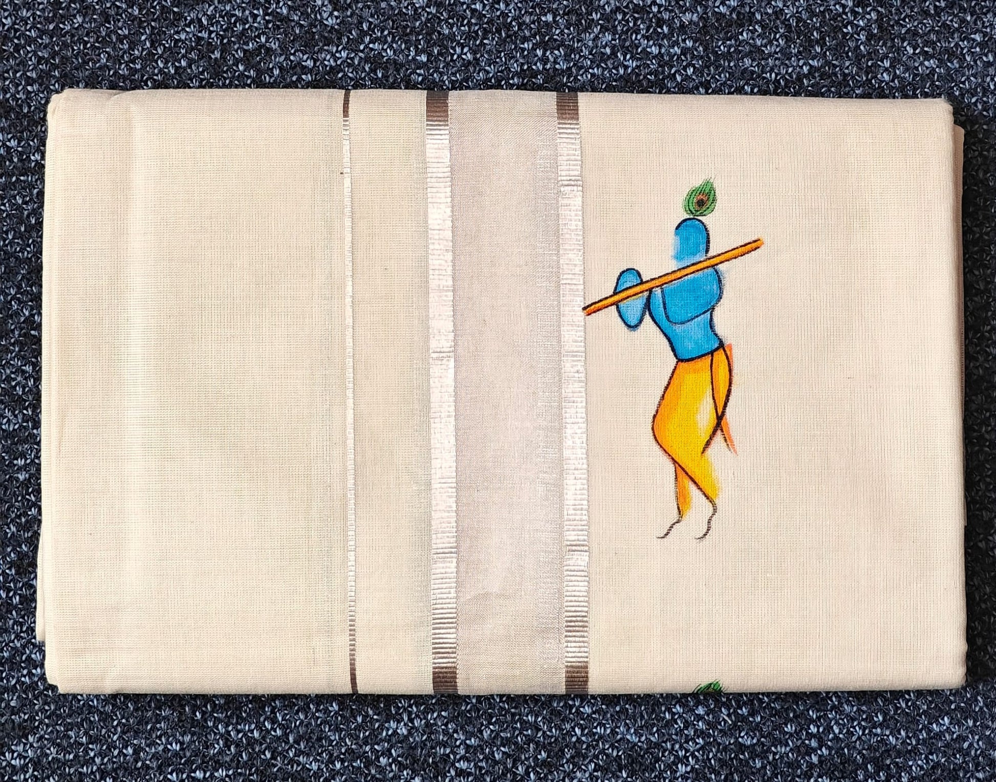 Kasavu Style | 1.5-inch Double Silver Kasavu border with KRISHNA print |