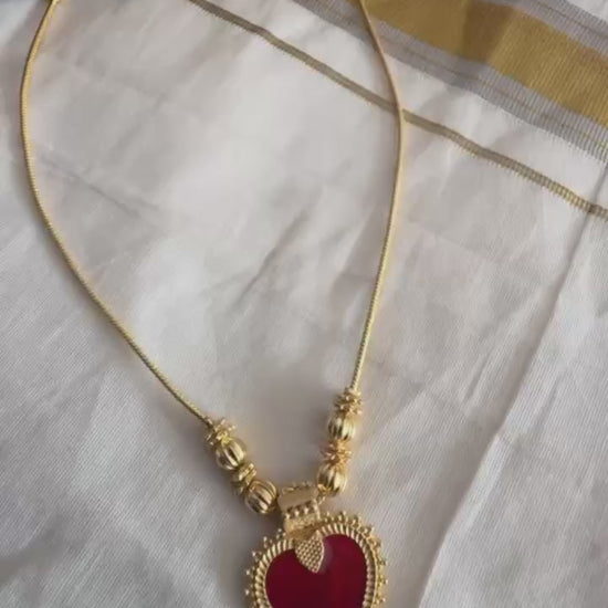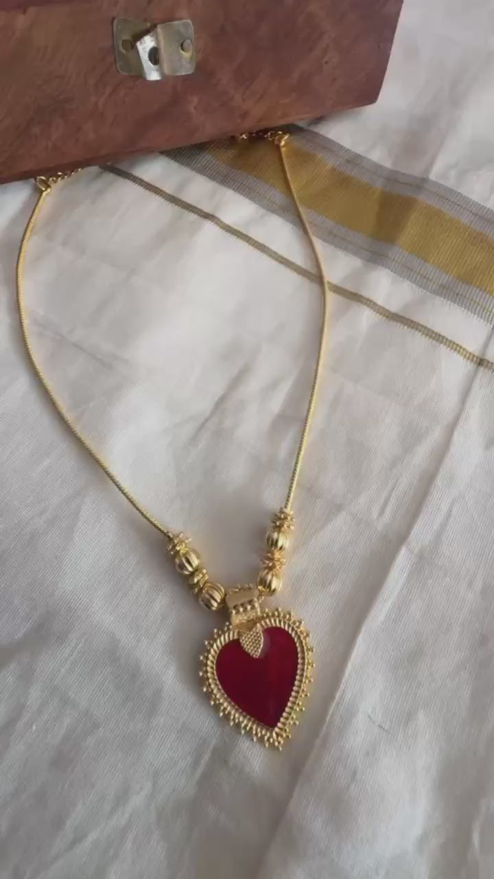 Celebrate elegance with this golden necklace, featuring a striking red heart-shaped pendant framed in intricate gold detailing. The bold red accent makes it a statement piece, while the fine craftsmanship keeps it rooted in tradition.