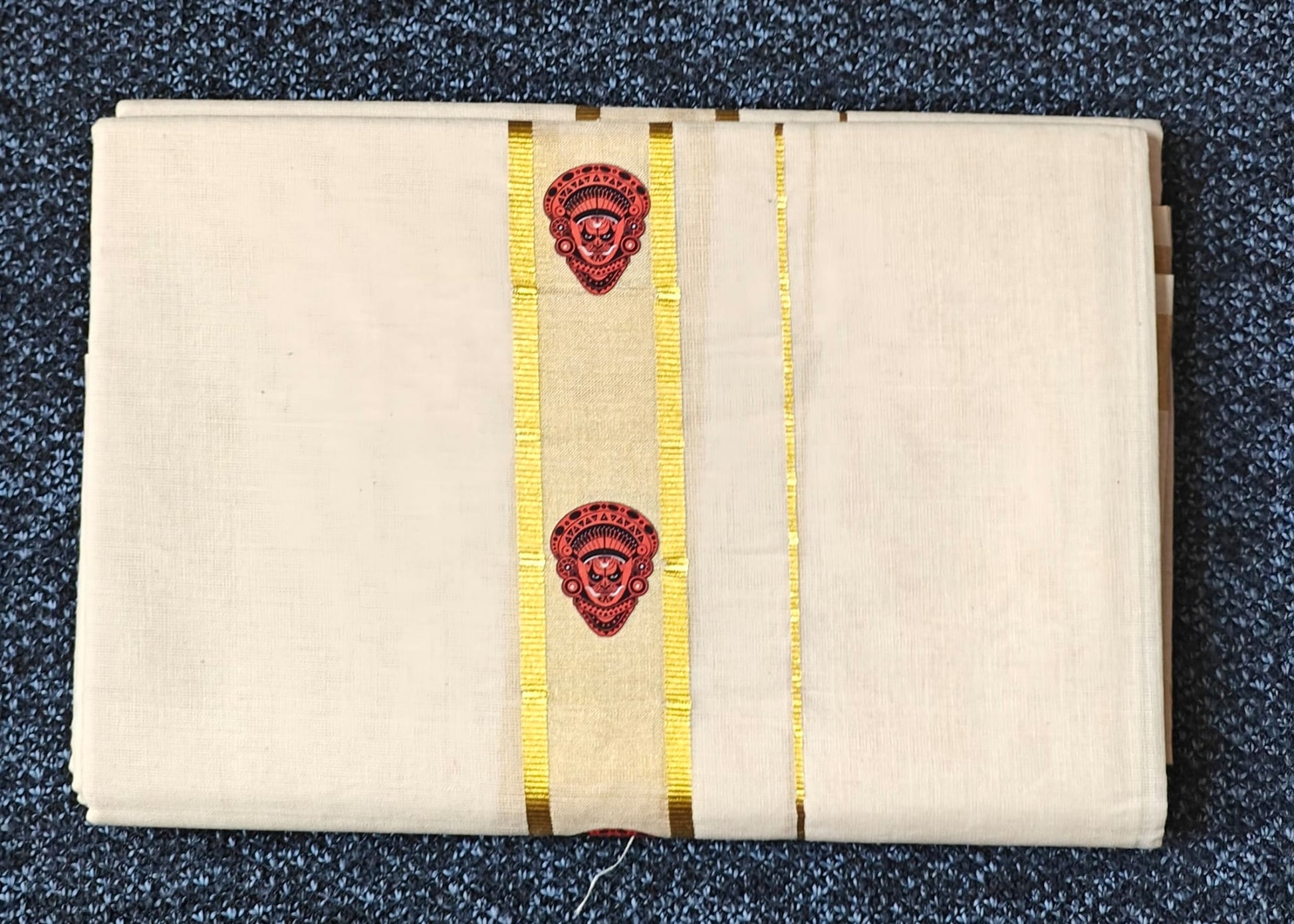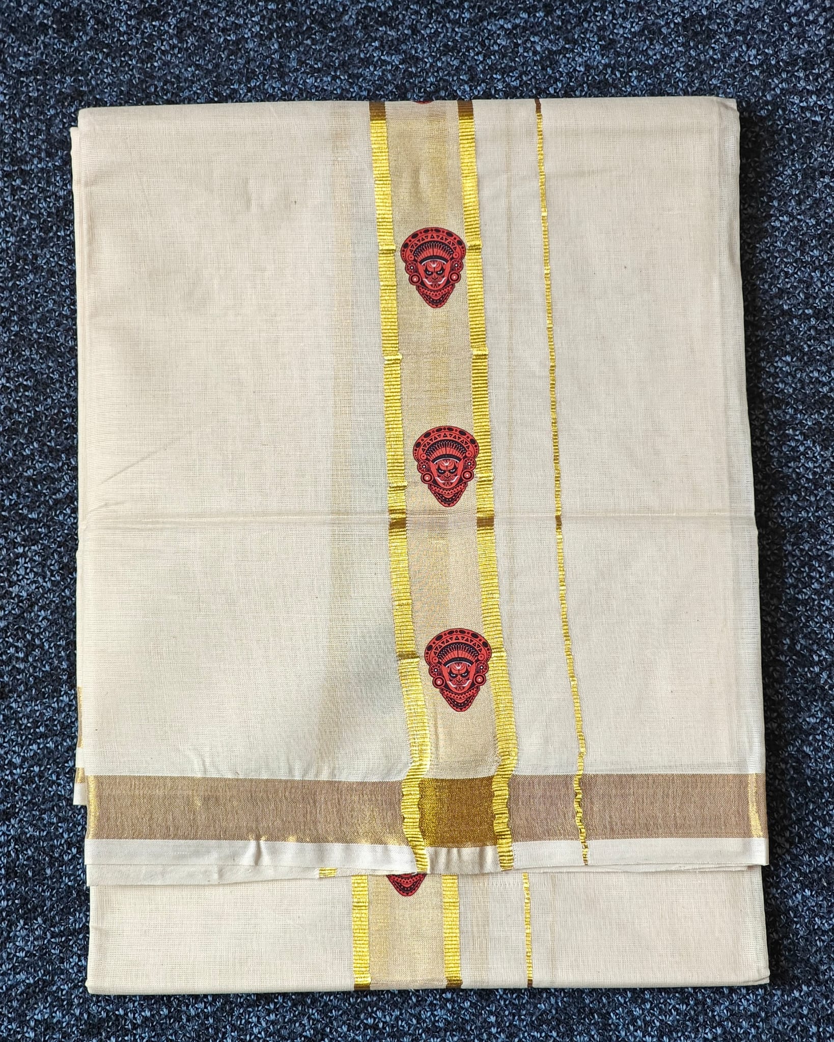 Design | Double Golden Kasavu Border with Culturally Rich Printed Motifs |