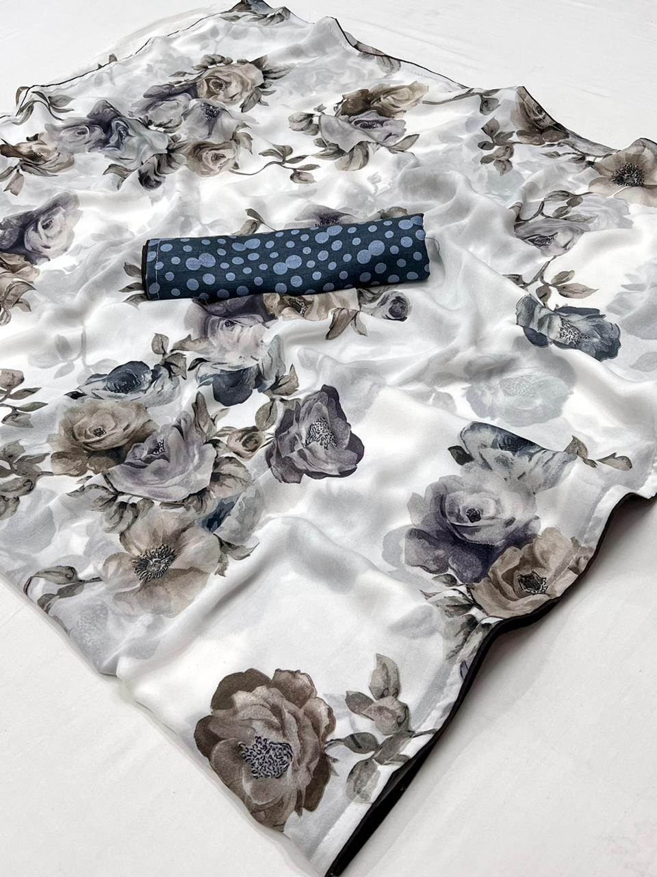 Celebrate in style with our white and navy blue flower georgette saree, crafted from heavy embose georgette fabric. The saree is adorned with a floral digital print and enhanced with a brasso effect all over, giving it a rich and festive appeal.